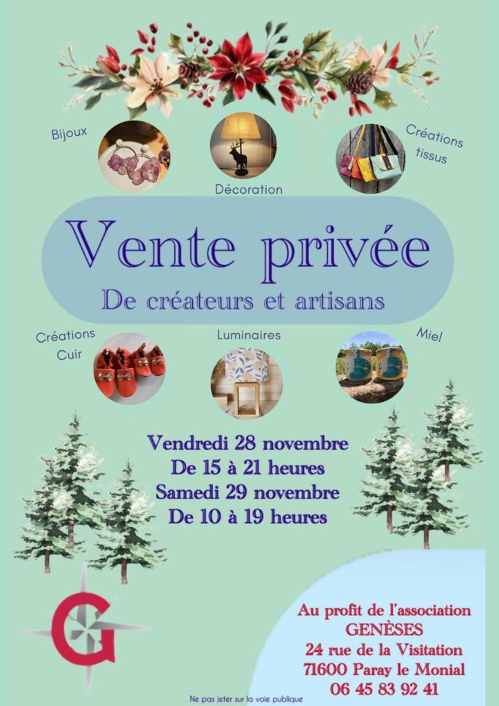 - une vente privée de créateurs et artisans (bijoux, vêtements, lampes, etc..) au profit de Genèses les 28 et 29 novembre dans nos locaux au 24 rue de la Visitation, à Paray-le-Monial