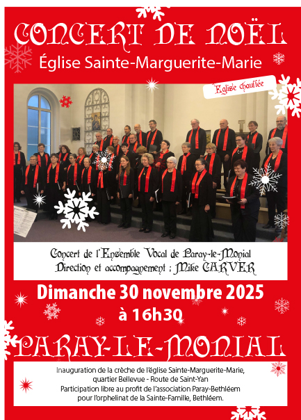 dimanche 30 novembre à 16h30 concert de Noël par l’Ensemble Vocal Parodien : entrée libre, église chauffée – les fonds collectés sont au bénéfice de l’orphelinat de la Sainte Famille de Bethléem – puis ouverture de la crèche et diverses animations à l’extérieur, suivie du verre de l’amitié offert par l’association.