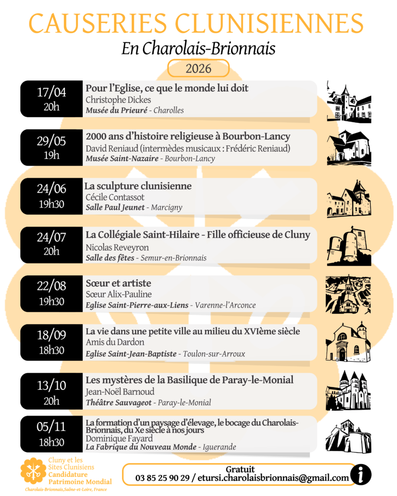 - Programme 2026 des « Causeries clunisiennes en Charolais-Brionnais » (conférences gratuites autour de l’héritage clunisien)