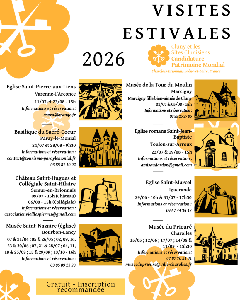 Dans le cadre de la candidature de Cluny et des Sites Clunisiens au Patrimoine Mondial de l’UNESCO, voici le programme des animations proposées par les huit sites du Charolais-Brionnais qui sont engagés dans la candidature.