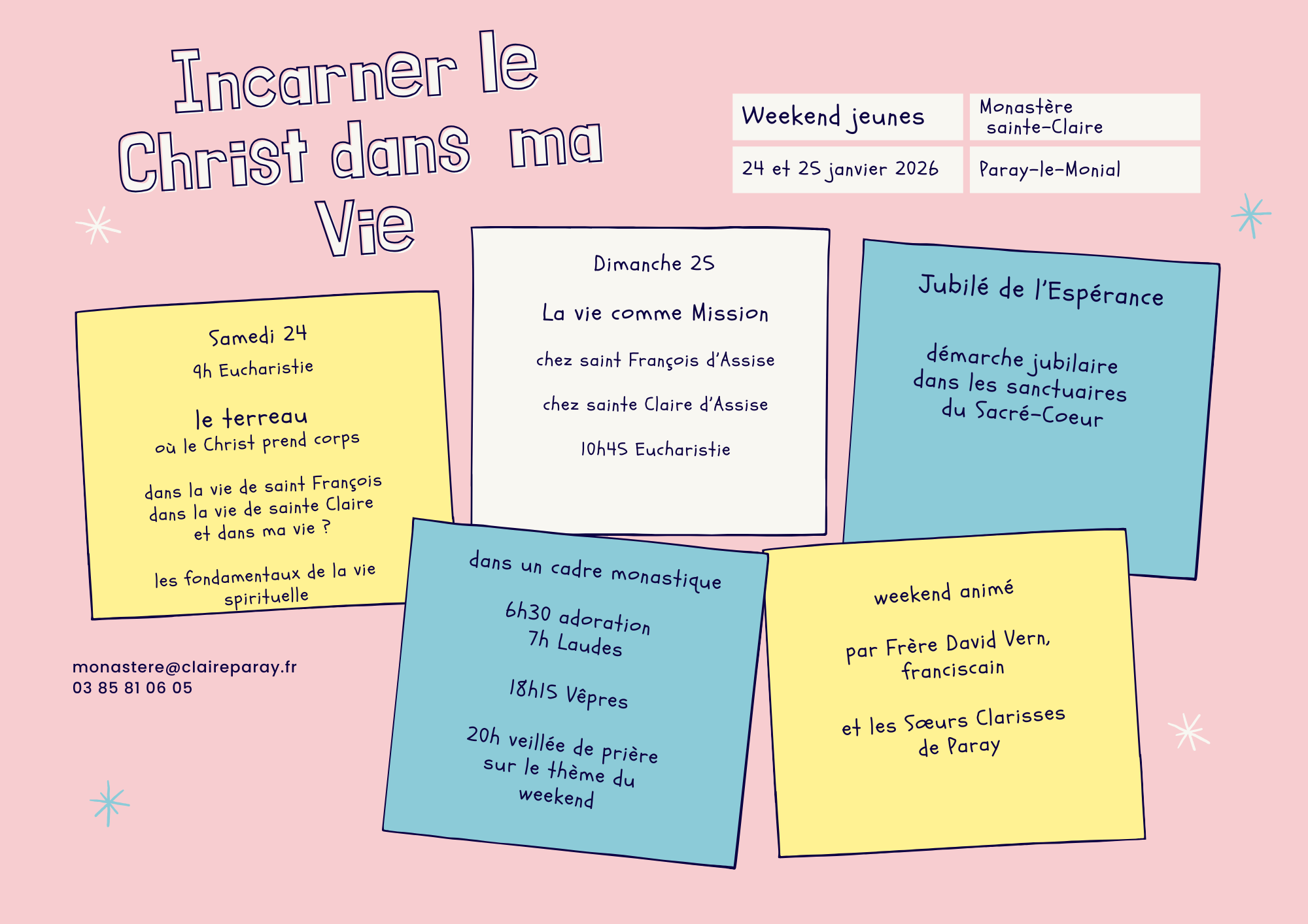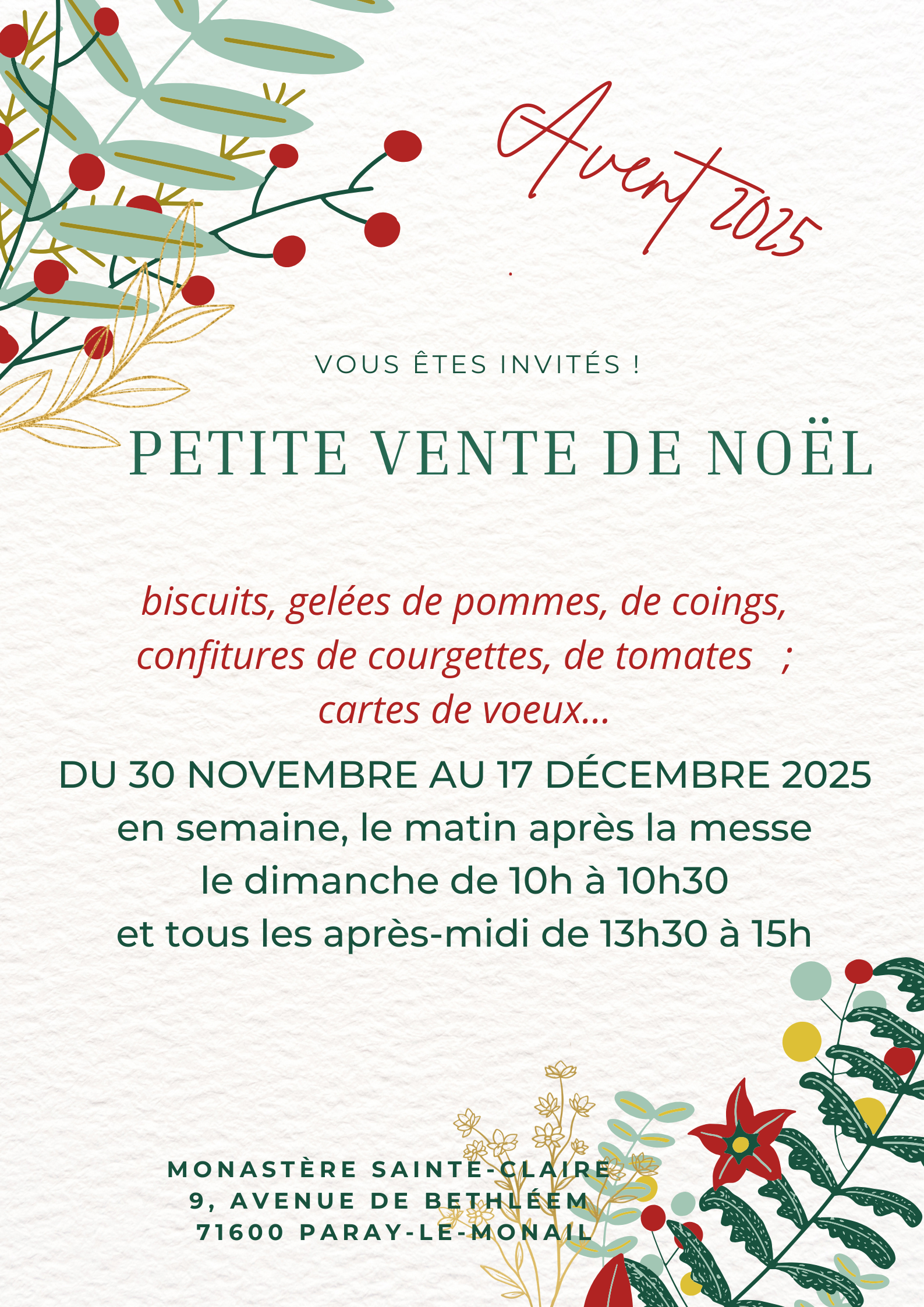Quelques chambres d’accueil nous permettent de recevoir des jeunes filles souhaitant réviser des examens dans le calme, vivre un temps de retraite, découvrir la vie monastique à la suite de sainte Claire venue se blottir dans la blessure du Cœur de Jésus comme la colombe dans le creux du rocher. Nous contacter : clarisses.paray71@orange.fr